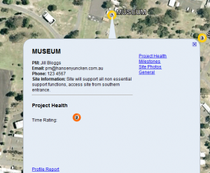 There are plenty of options using a ballon popup in Google Earth to get a nice formatted popup which can be used for corporate reporting. I’ve put in an example below which shows an example for a project site. This enables a quick summary of project health by location.